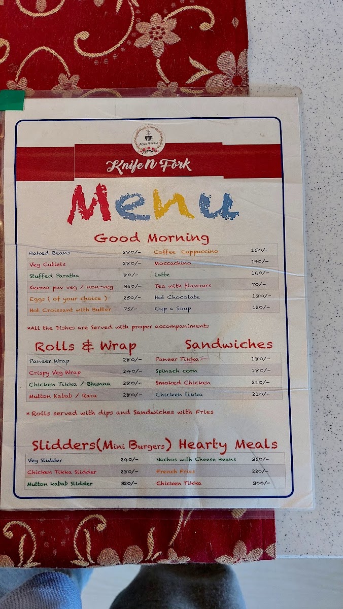 Introducing Knife n Fork, a delightful café nestled in Lakarmandi, near the beautiful Forest Barrier in Dalhousie. This warm and cozy spot is perfect for both casual meals and special moments. The menu bursts with an array of flavours, featuring everything from hearty Baked Beans and Stuffed Parathas for breakfast to delicious wraps like Paneer Wrap and Chicken Tikka for lunch. Don't miss their mouthwatering sandwiches, including Smoked Chicken and Paneer Tikka.